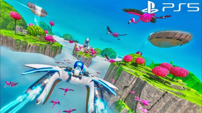 Astro bot flying into a level on his spaceship