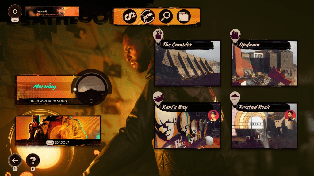 Deathloops time of day screen. You can choose from the 4 locations of where to go, at the 4 different times of day. (Morning, Noon, Afternoon, Evening)