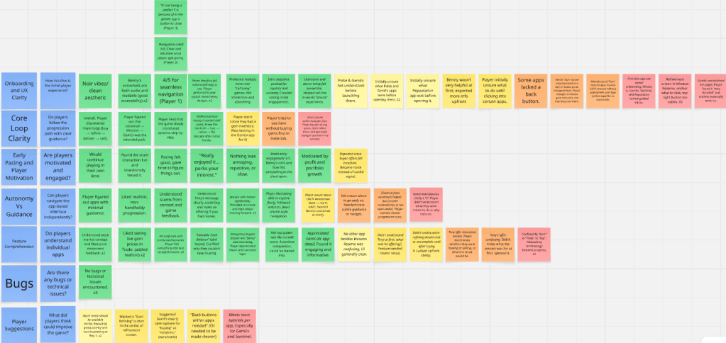 Figure 3: Miro board used to categorise playtest feedback by theme and severity.